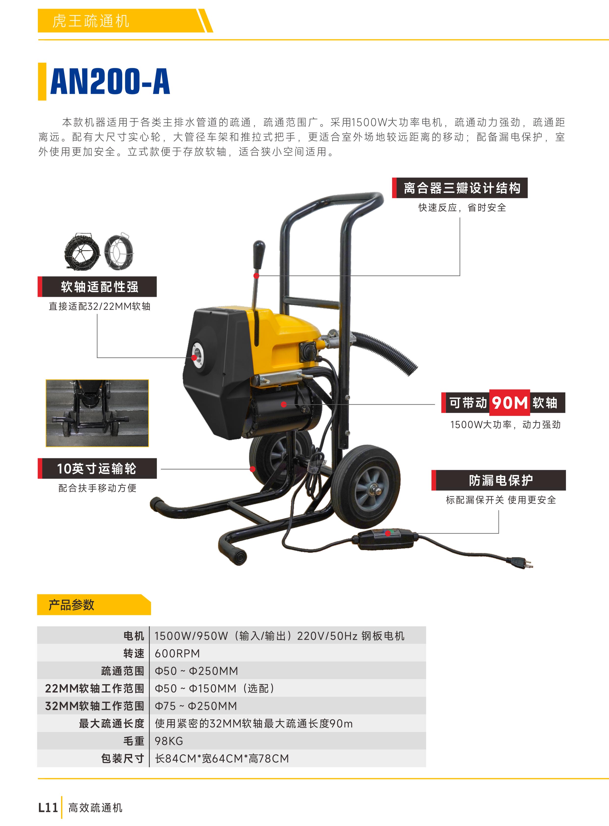 本款机器适用于各类主排水管道的疏通,疏通范围广。采用1500W大功率电机,疏通动力强劲,疏通距离远。配有大尺寸实心轮,大管径车架和推拉式把手,更适合室外场地较远距离的移动;配备漏电保护,室外使用更加安全。立式款便于存放软轴,适合狭小空间适用。