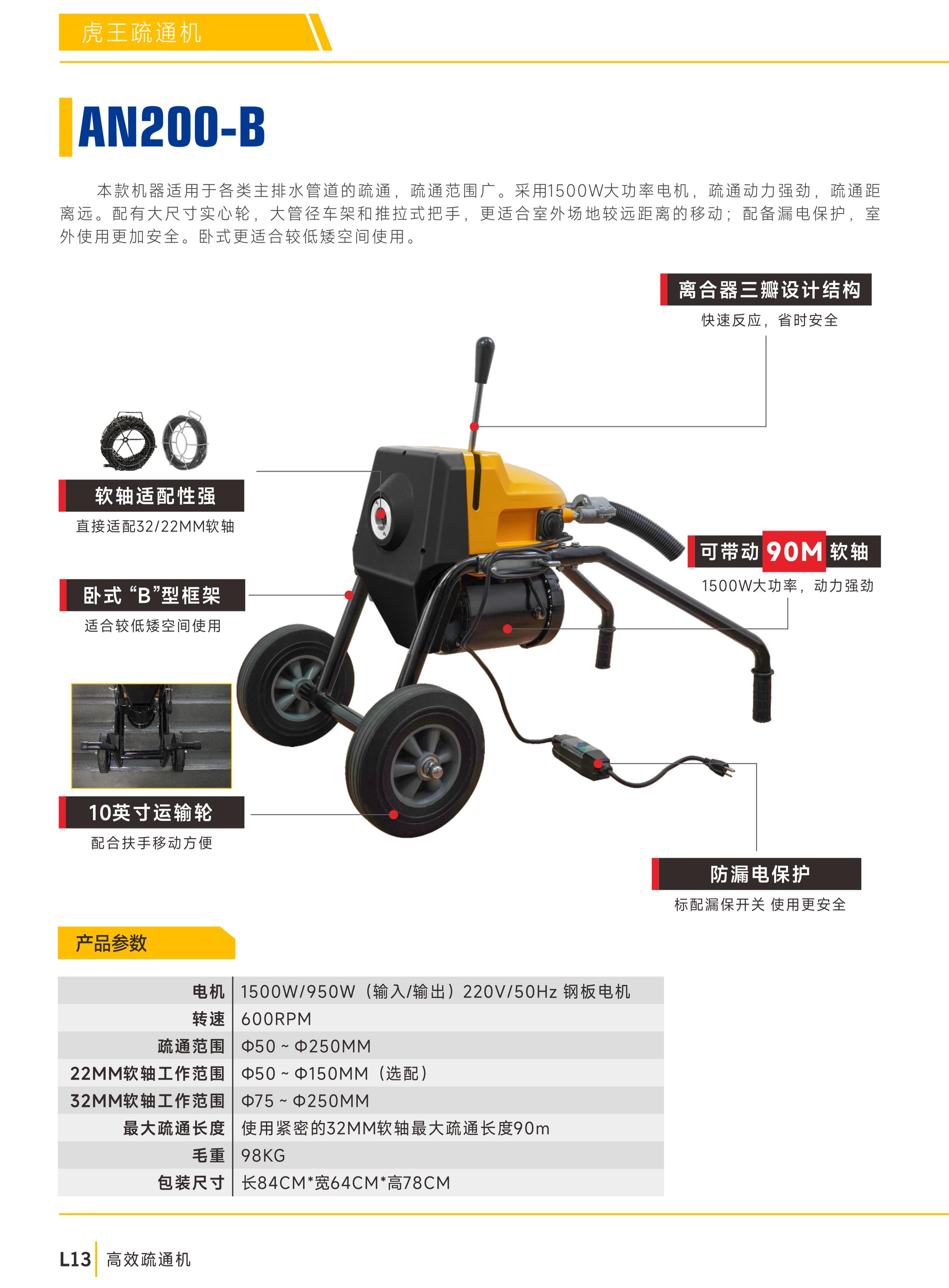 本款机器适用于各类主排水管道的疏通,疏通范围广。采用1500W大功率电机,疏通动力强劲,疏通距离远。配有大尺寸实心轮,大管径车架和推拉式把手,更适合室外场地较远距离的移动;配备漏电保护,室外使用更加安全。卧式更适合较低矮空间使用。